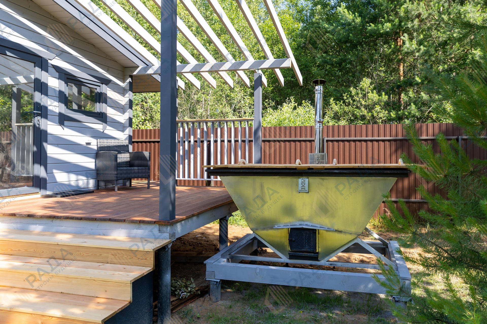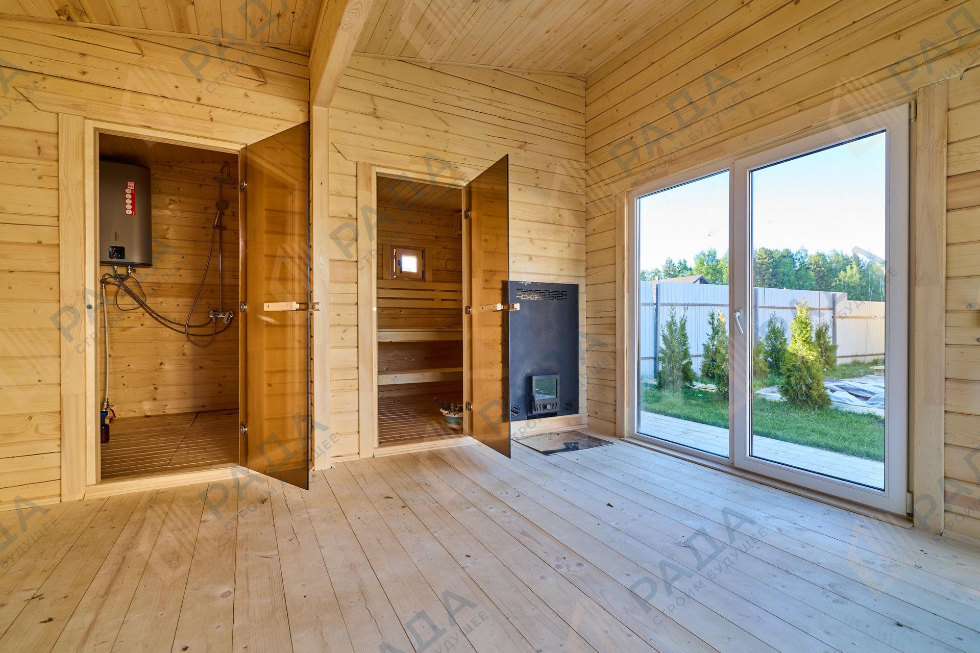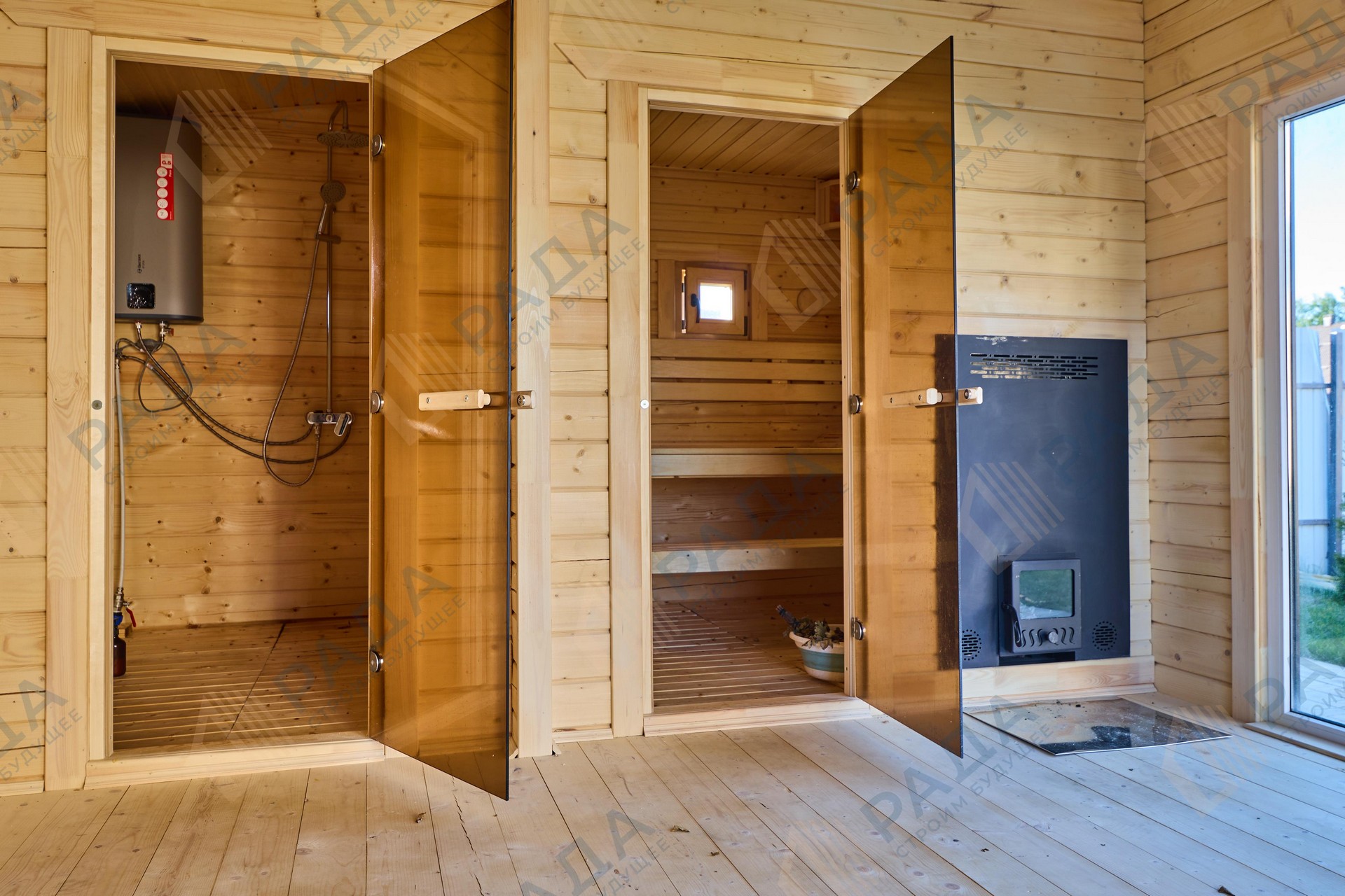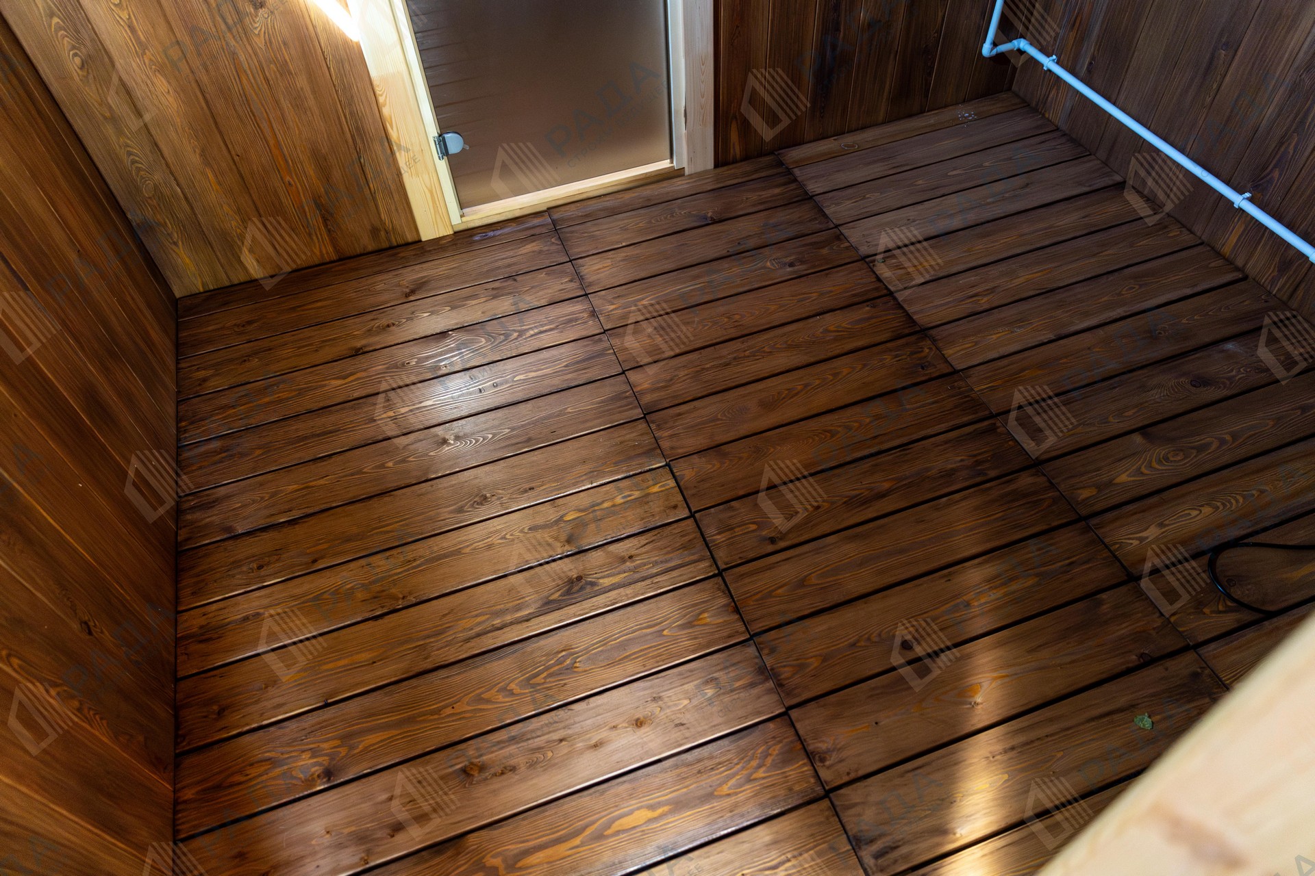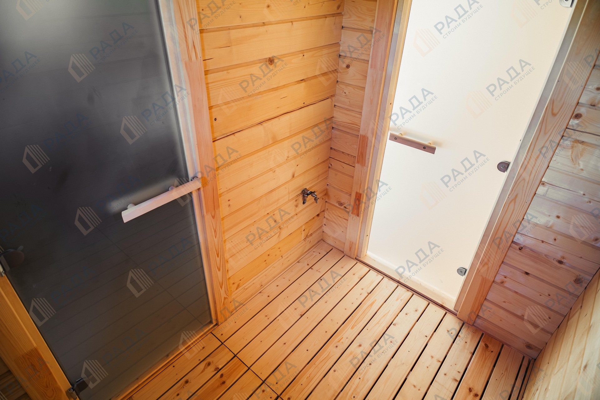 Не гниёт, не чернеет и не трескается. Срок службы — до 50 лет благодаря импрегнации древесины в вакуумной камере и системе проливного пола, исключающей контакт воды с конструкцией.