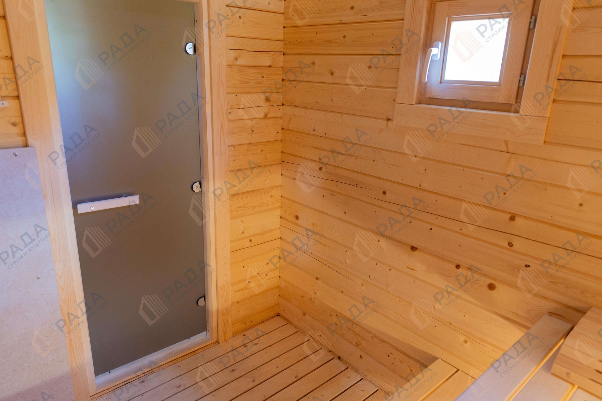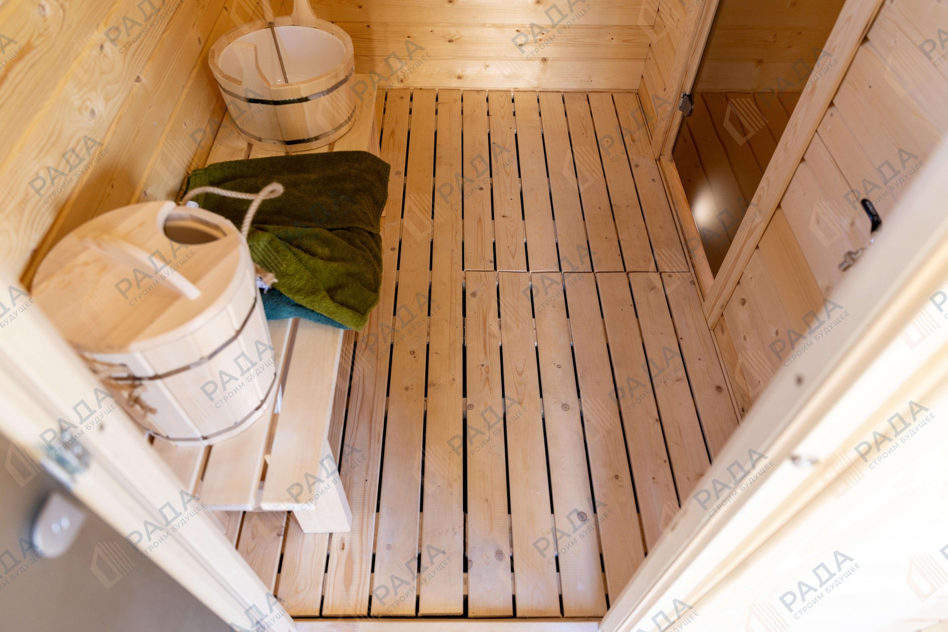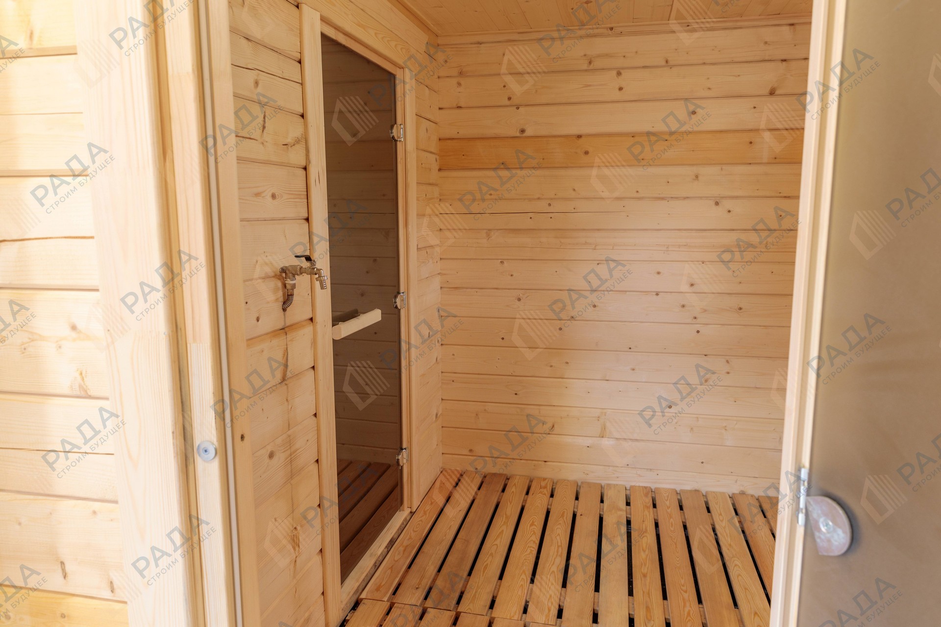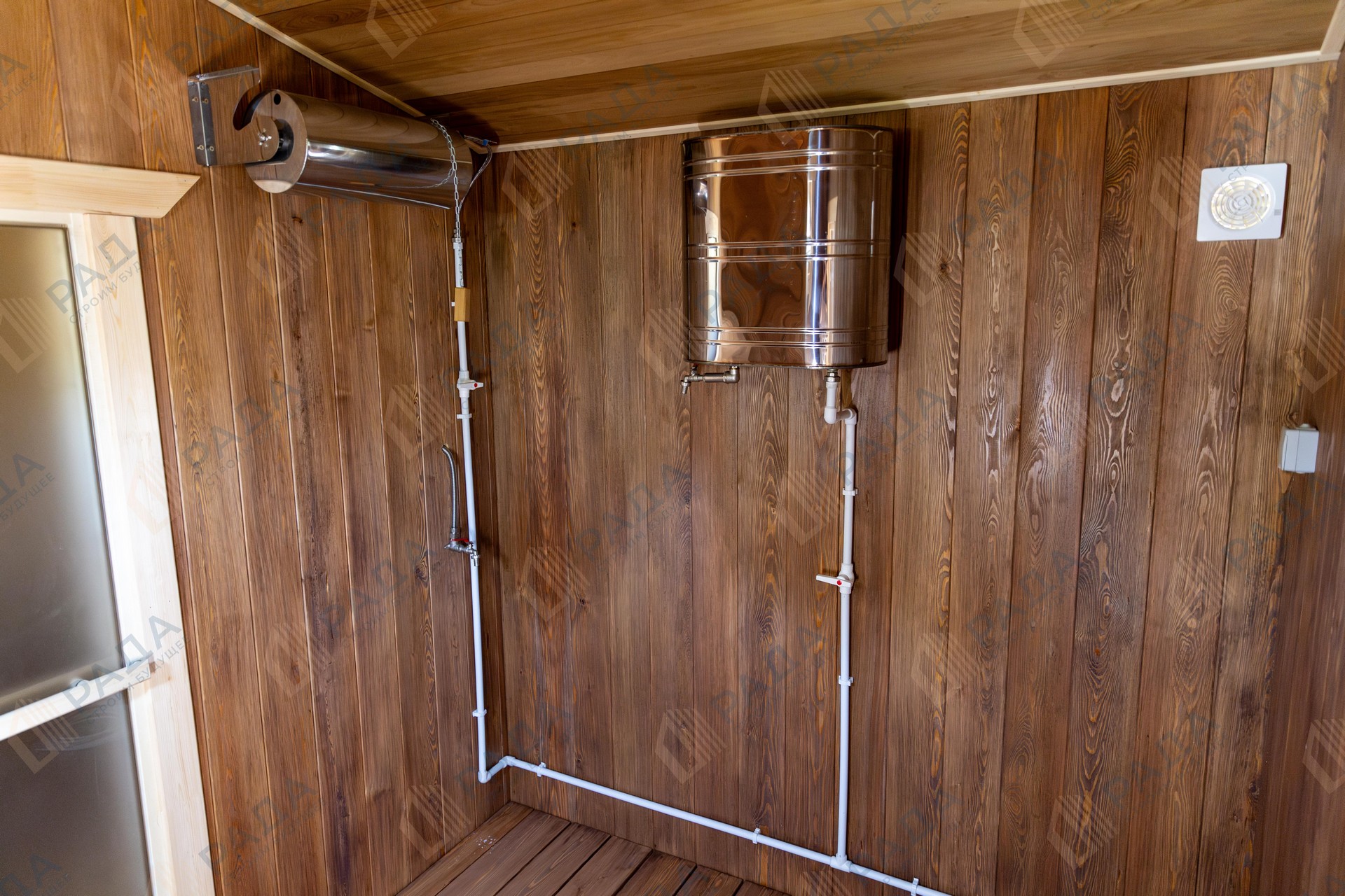 Не гниёт, не чернеет и не трескается. Срок службы — до 50 лет благодаря импрегнации древесины в вакуумной камере и системе проливного пола, исключающей контакт воды с конструкцией.