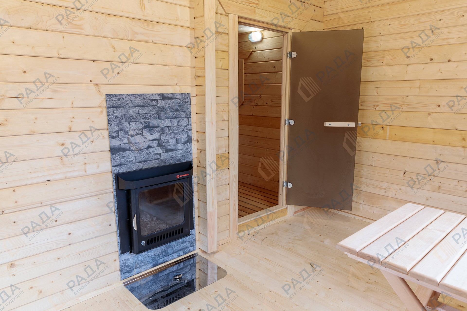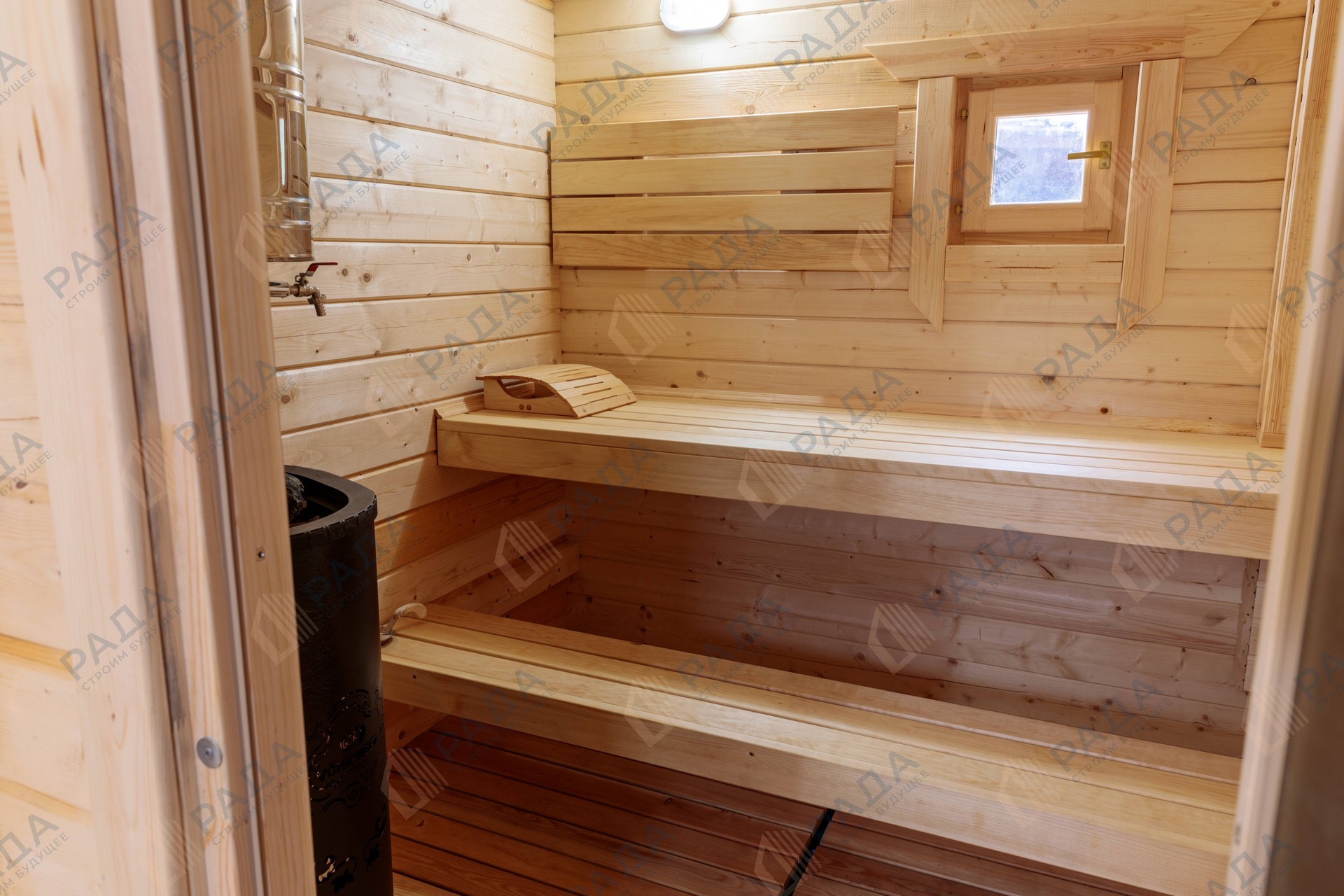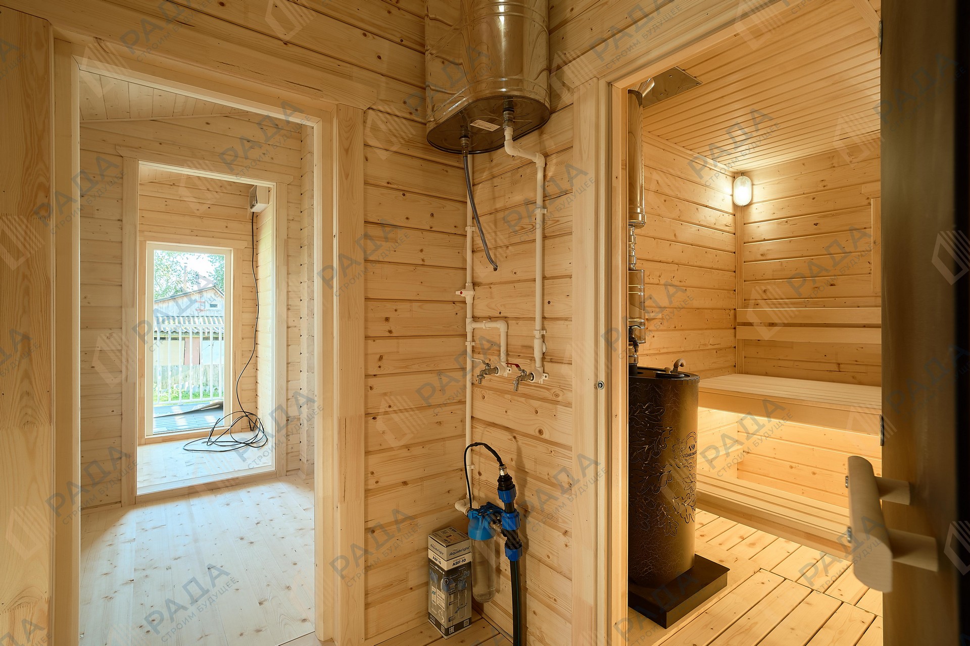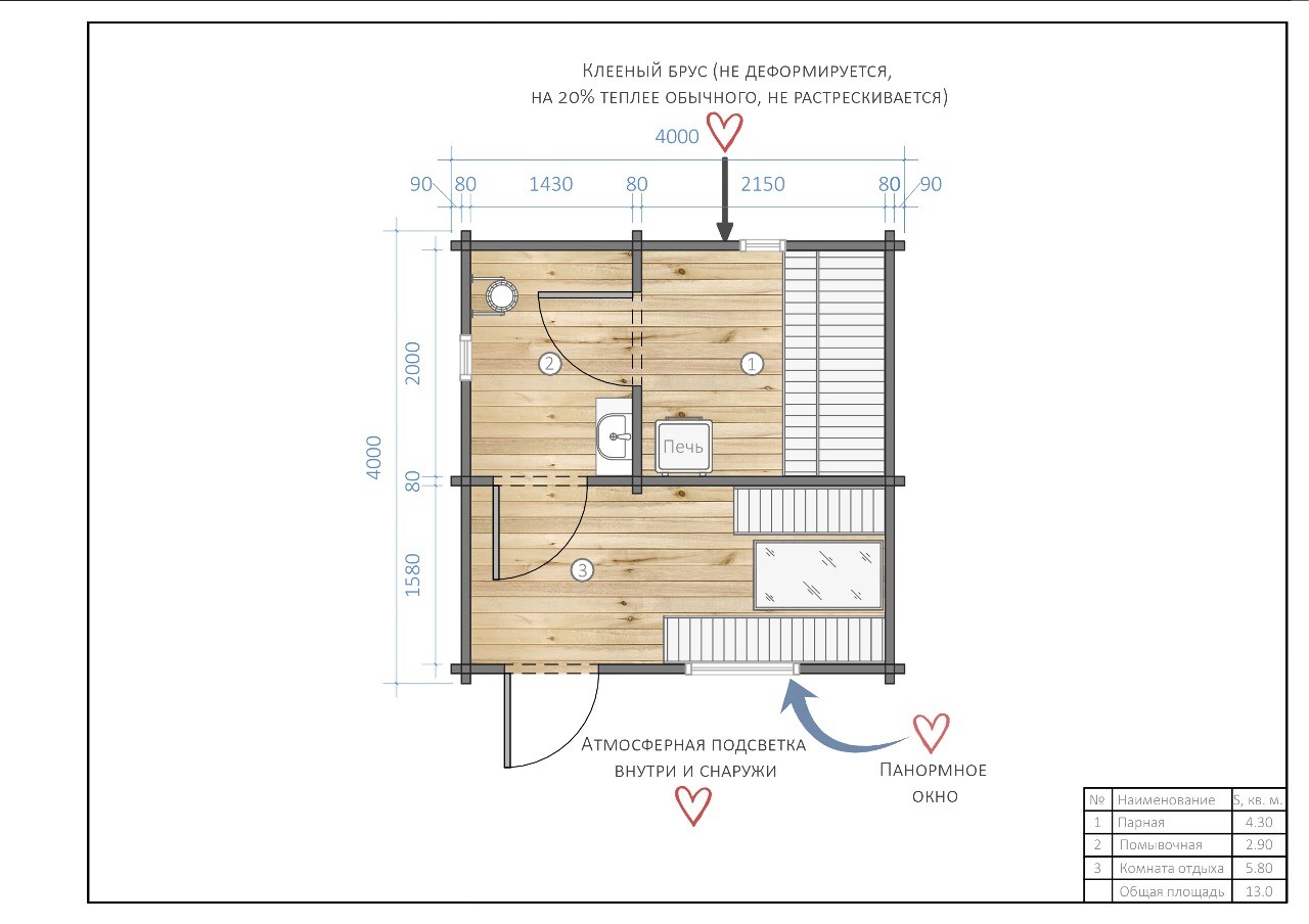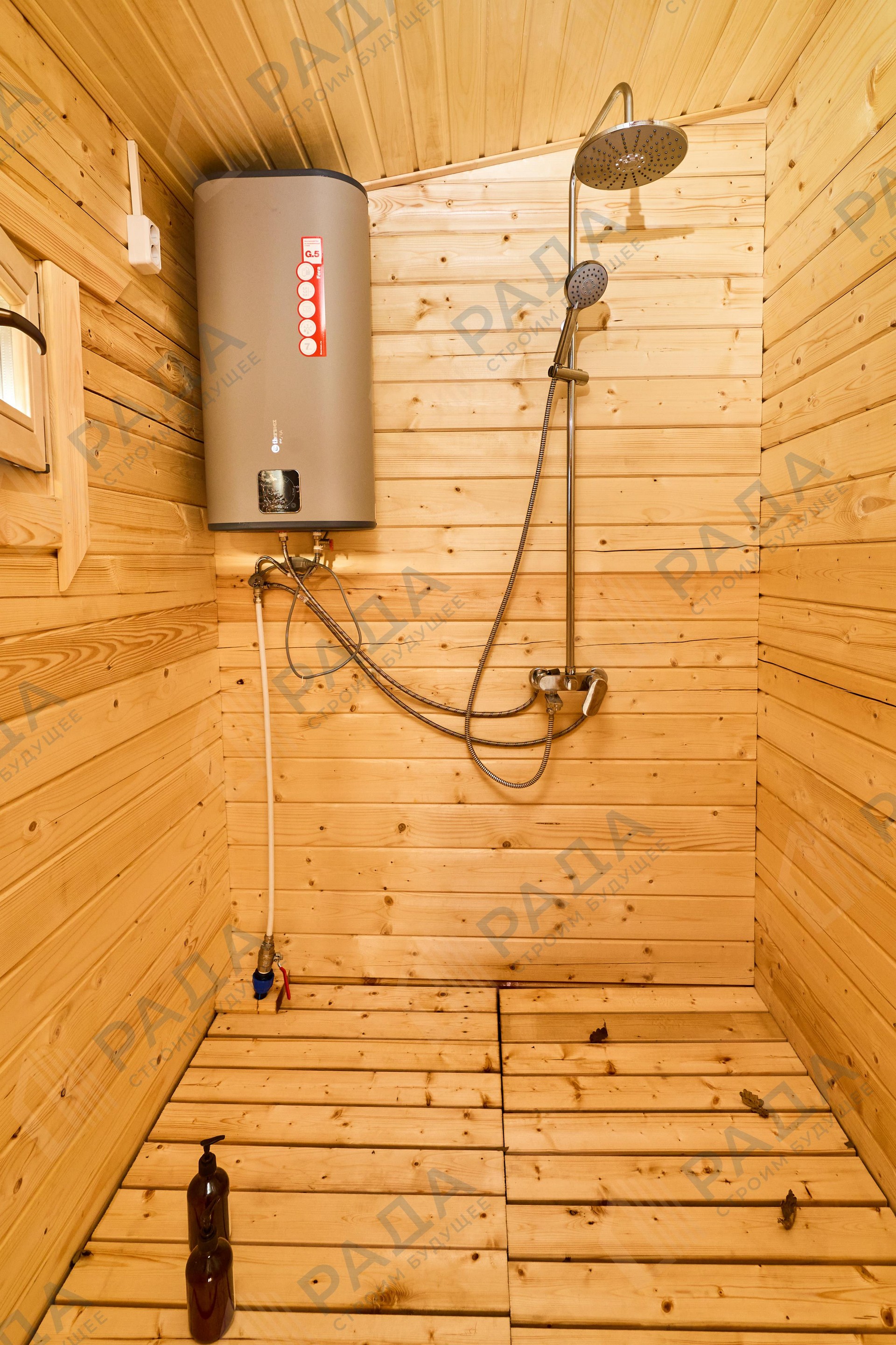 Не гниёт, не чернеет и не трескается. Срок службы — до 50 лет благодаря импрегнации древесины в вакуумной камере и системе проливного пола, исключающей контакт воды с конструкцией.