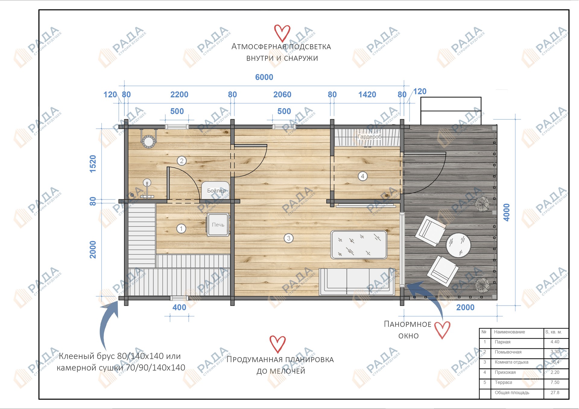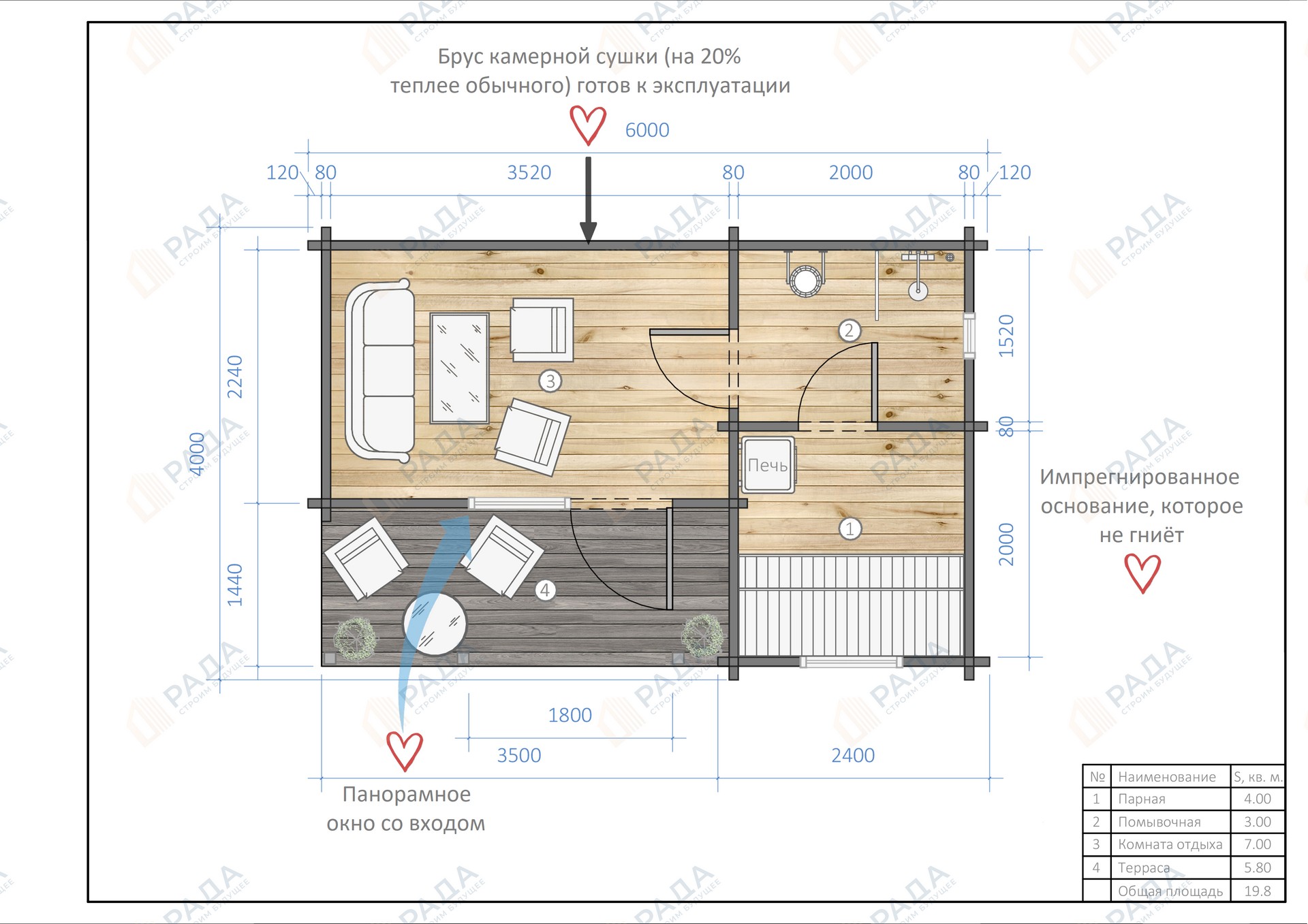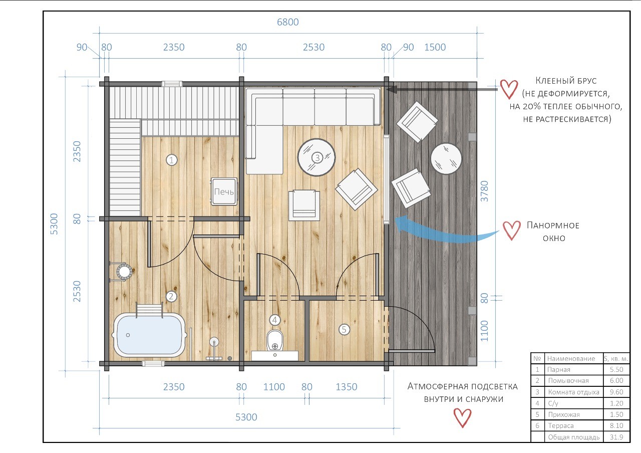Размеры 7х3 метра + терраса 3х3 метра
